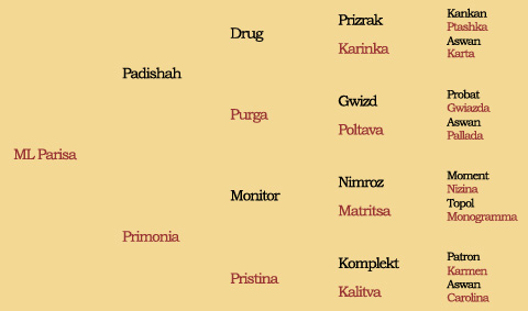 Primonia's Sire is Monitor - World & European Champion, bred by Tersk and Sire in several countries. Today he is owned by King Abdulaziz Arabian Horse Center in Saudi Arabia. Monitor is by Nimroz - Multi Show Champion with good racing results. Nimroz's Sire is Moment - a legendary producer at Tersk and later in USA. Moment is National Champion in Holland and a full brother to Muscat. Monitor's dam Matritsa also achieved excellent results in racing. She is out of the tremendous broodmare Monogramma and through her sister to the Stallions Monogramm, Mamluk and Murmansk. Primonia's dam Pristina has been a broodmare in Holland, Belgium and France, she is among others the dam of Prismen - Sire in Holland. Pristina is by Komplekt - World res. Champion, National Champion and Stallion res. Champion Aachen. Komplekt was considered to have some of the best movements, people ever saw in the European Show scene. He is the Sire of Anthal - Multi Show Champion, Kajgala - World Top Ten Mare, Naik - Sire in Holland and Khamil - Sire in England. Pristina's dam is the Aswan daughter Kalitva - broodmare in Holland and England (her offspring was among others exported to UAE and Italy).