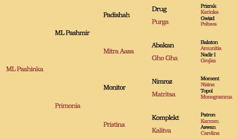 ML Pashmir’s dam Mitra Aasa is an unique mare with gorgeous type and spectacular movements, imported from France. Mitra gained Champion titles in the Showring several times, but most important, she is an exceptional broodmare. Mitra is by Champion Stallion Abakan (a very successful producer bred by Tersk). Her paternal grandsire Balaton and maternal grandsire Nadir I also achieved the European Champion title. Mitra’s pedigree contains, besides well-known stallions, some wonderful mares as well. Her dam Gho Gha is owned by Princess Alia Al Hussein “The Royal Stud of Jordan”, and Mitra’s granddam Grojka has been a broodmare at Shah Arabians in France for many years. There is more information about ML Pashmir, Mitra Aasa and Padishah on their own pages.